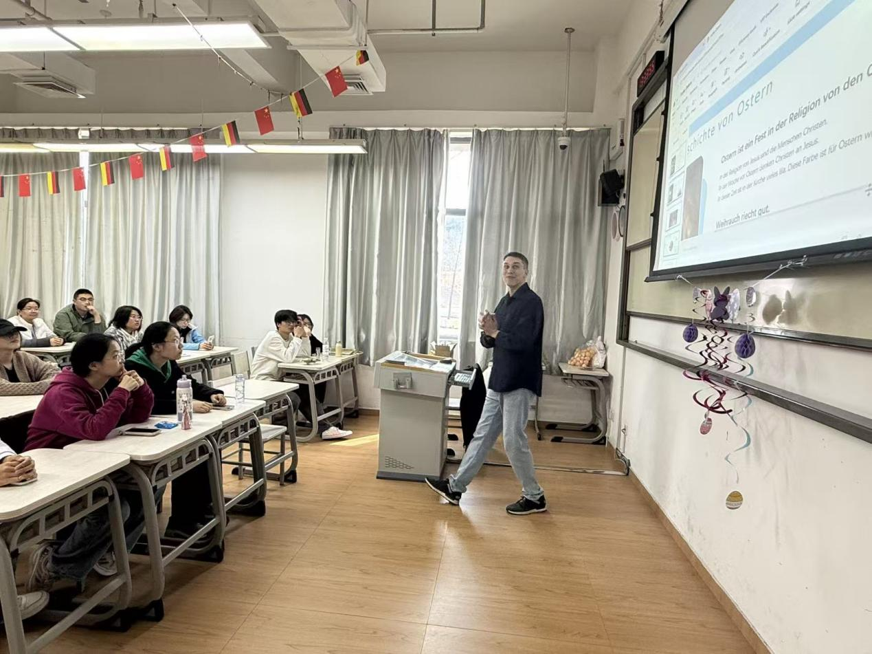 为激发学生德语学习兴趣,让同学们在沉浸式文化氛围中感受德语魅力,中德工程学院组织德语外教于3月31日精心开展了一期复活节主题德语角活动。同学们与外教零距离互动,在画彩蛋、藏彩蛋的欢乐时光里,解锁德语学习新乐趣。