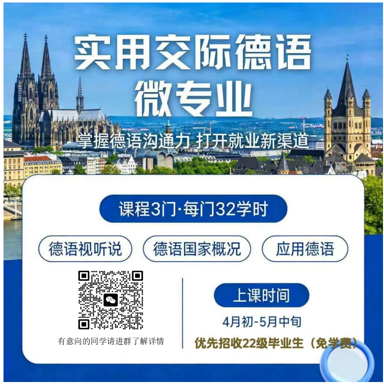 为贯彻落实教育部《关于实施高校学生就业能力提升“双千”计划的通知》《关于发布“双千”计划新一批急需紧缺“微专业”建设方向的通知》等有关文件精神,服务中德产业合作与国际交流发展需求,提升学生德语实际运用能力、跨文化沟通能力、就业途径,中德工程学院现开设微专业《实用交际德语》,并全面开展招生工作,现将有关事项通知如下: