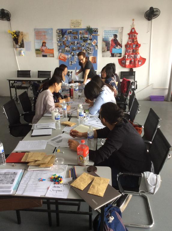 此次培训和研讨会的主题为“德语A1-C1级别的口语教学法”,重点包括德语语音练习教学法、词汇练习教学法、自由表述教学法、德福口头表达能力拓展教学法等内容。施里姆巴赫女士根据中国学生在A1-C1级别的德语学习和德福口语备考中的问题提出针对性建议,分享了自己多年来在中国德语教学中积累的资料和经验,通过一些课堂游戏及口语练习与德语教研室同事们进行了深入探讨与互动,现场氛围积极活跃,效果良好。