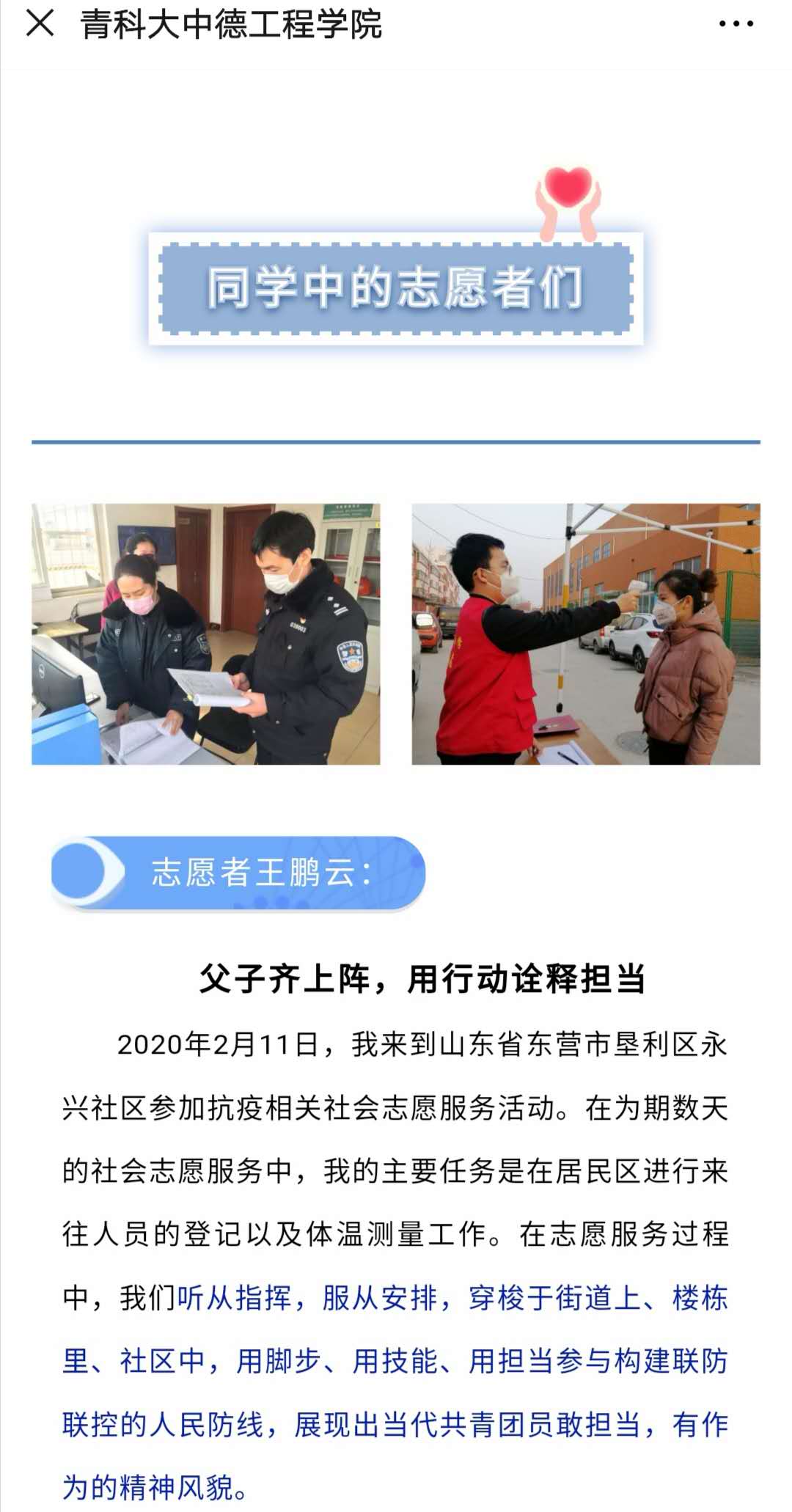 2020年的春节,遇上来势汹汹的新型冠状病毒感染的肺炎疫情。这是一场突如其来的疫情,也是一次前所未有的考验。面对考验,疫情就是命令,防控就是责任。连日来,中德校区师生党员、干部员工发扬连续作战精神,书记带头,冲锋在前,持续奋战在疫情防控阻击战最前沿,切实把疫情防控各项工作抓实抓细抓落地,精准解决疫情第一线问题,以教育人的实际行动践行初心使命,让阻击战旗在战“疫”一线高高飘扬。