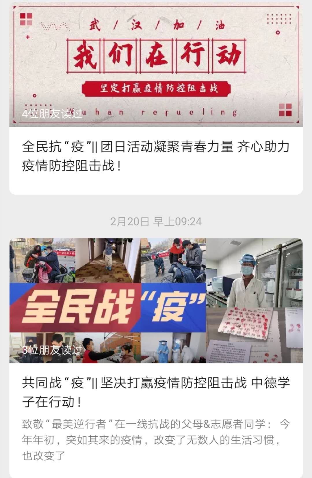战疫信心从坚。校区组织各班级开展“同心同向、共克时艰”线上主题团日活动,引导广大团员青年积极行动,助力疫情防控,履行好青年学生思想引领的职责使命。广泛宣传学校师生参与制作的《天使的印记》、《武汉,我为你加油》、《以画传情,助力武汉》等作品,弘扬正能量,增强学生爱校荣校的感情和战胜疫情的信心。