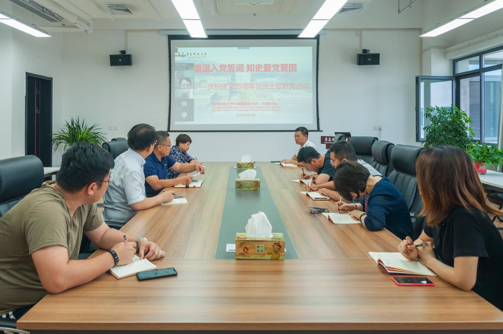 为庆祝中国共产党成立99周年,深入了解我们党领导人民艰苦卓越的斗争历程,6月30日下午,青岛科技大学中德国际合作区(中德校区)开展了建党99周年“重温入党誓词 知史爱党爱国”主题教育活动和“学党史 知党情 着力强化对党的忠诚信赖和看齐追随”专题党课,国内外全体党员通过线上、线下方式参加了活动。校区党总支书记王永波主持活动。