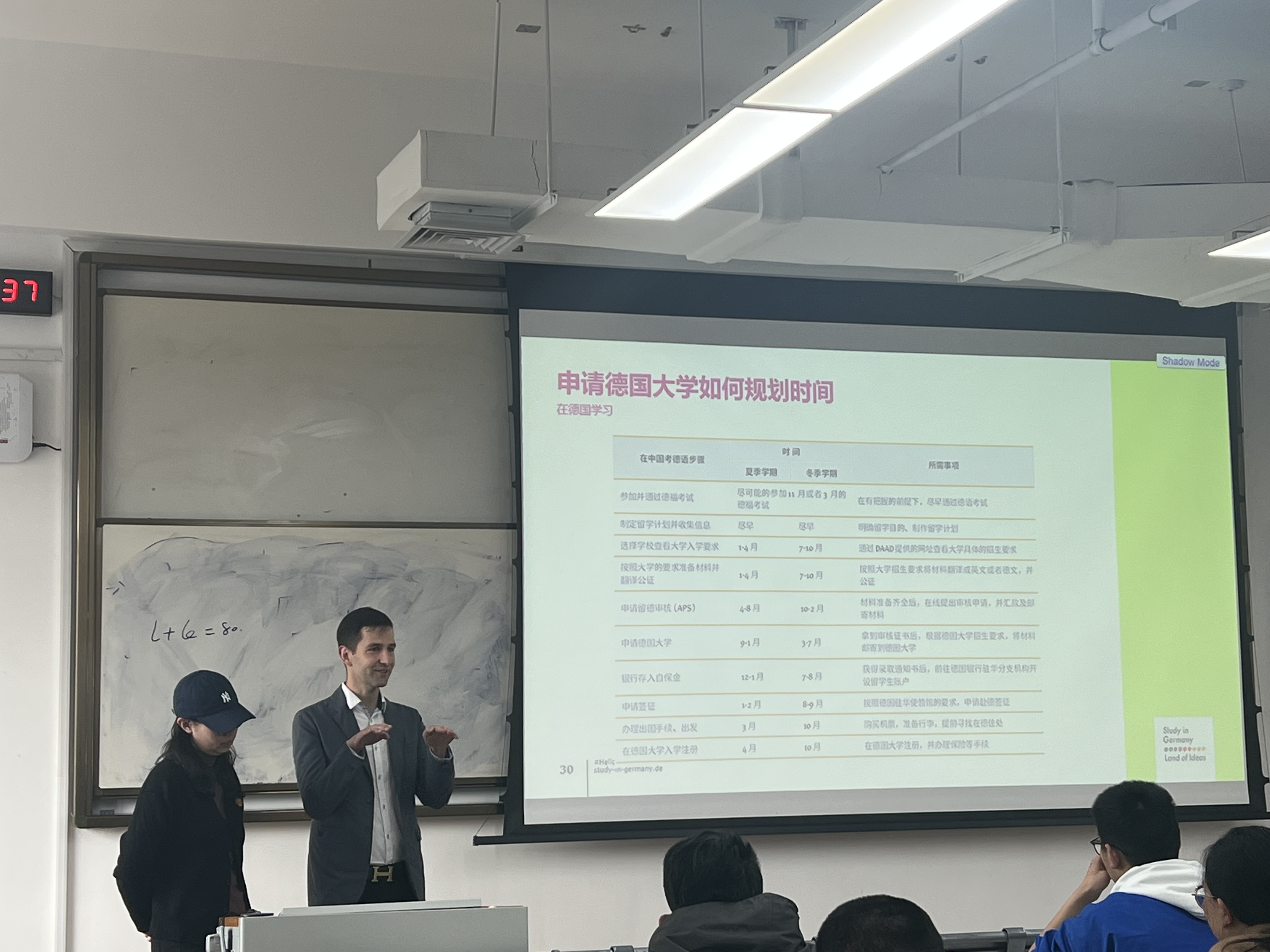 Eugen Zak老师向学生们介绍了德国学术交流中心(DAAD)的职能、德国的高等教育体制、申请德国大学的步骤及所需材料以及在德国学习和生活需要注意的问题。