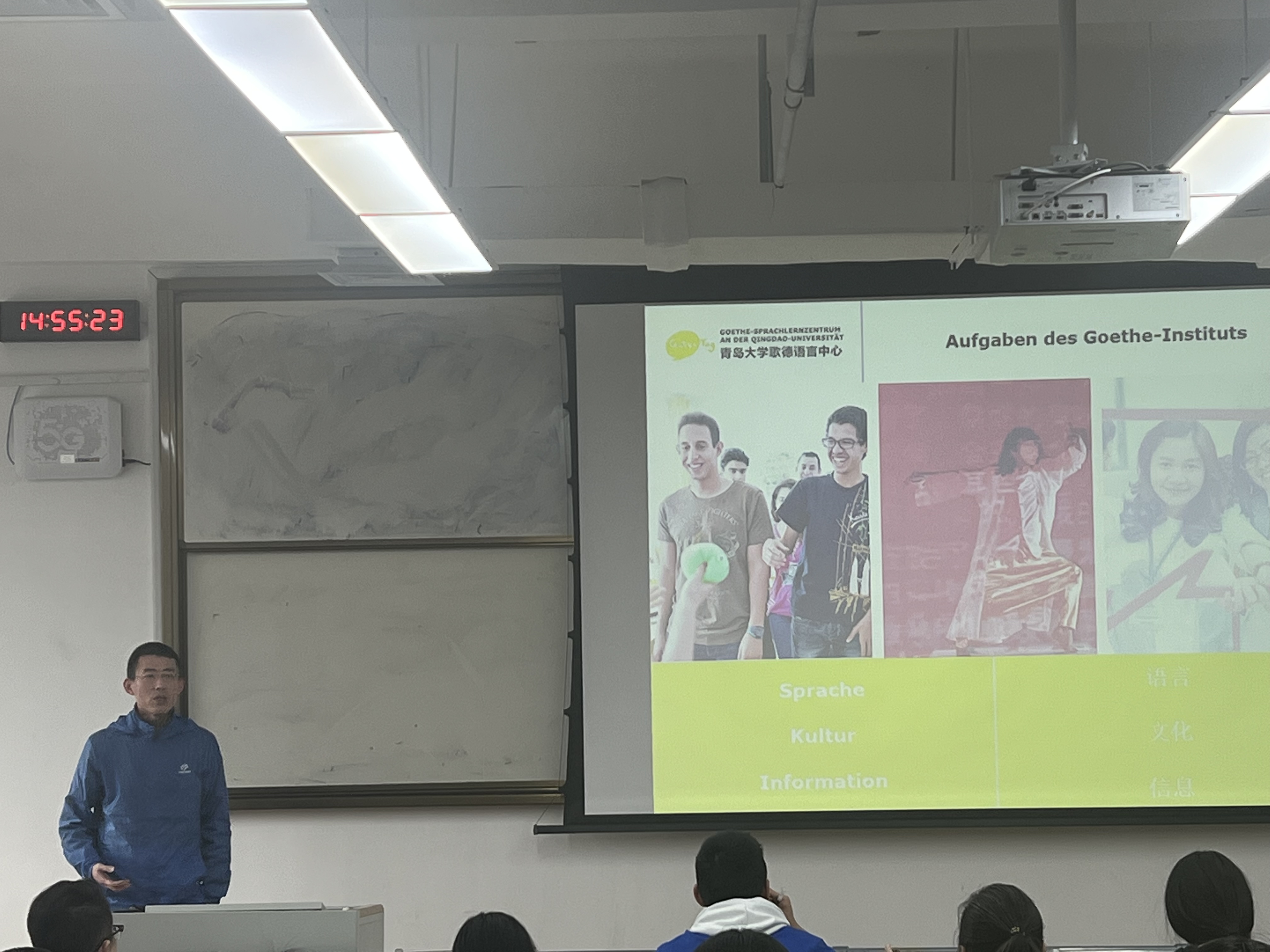 青岛大学歌德语言中心教学主管高乾老师就德语学习、德国大学优势学科、歌德学院的主要工作以及歌德语言证书等级考试等内容进行了介绍。高老师鼓励大家开口说德语、日常用德语,给同学们提供了很多提高德语水平的建议。