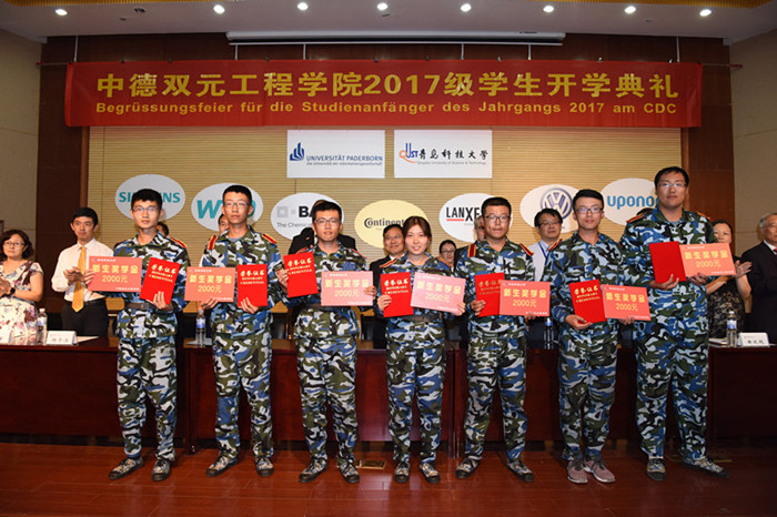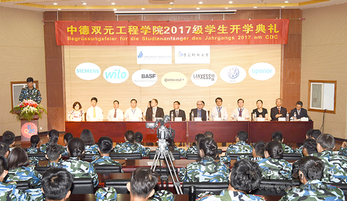 9月13日,中德双元工程学院2017级学生开学典礼在第一报告厅举行。校党委副书记、中德双元工程学院院长李庆领、德国帕德博恩大学中德校区项目负责人Wolfgang Bremser、巴斯夫股份有限公司亚太涂料应用研究高级经理Stefan Fueldner、国际处处长张宜恒、学生处处长陈刚、宣传部部长任允晓、教务处副处长张树海、学院直属党支部书记曲斌艳、副院长杨子江、德语中心郭爱成、学院全体师生参加了活动。会议由常务副院长岳学海主持