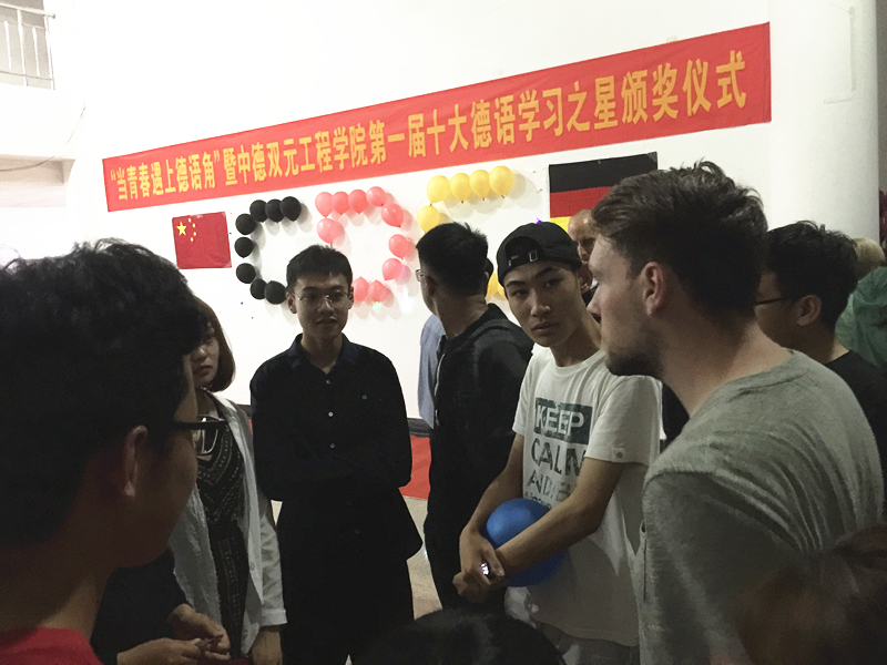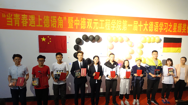 德语中心主任郭爱成与大家分享了自己40余年德语学习的感受,并勉励同学们树立勤奋学习、终身学习的意识,祝愿同学们早日去德国留学,随后邀请德国外教和留学生逐一进行了自我介绍。副院长罗毅宣读了《关于表彰中德双元工程学院第一届十大德语学习之星的决定》,对获得十大德语学习之星的同学们表示真诚的祝贺。学院领导为获奖同学颁奖并合影留念。颁奖仪式结束之后,获奖同学代表韩佳楠和李浩男分别用德语发表获奖感言并分享德语学习经验,对出国留学给予了高度期待。
