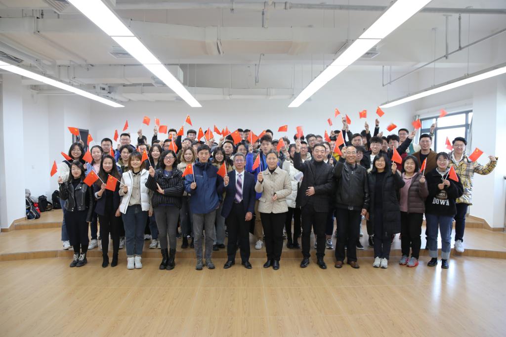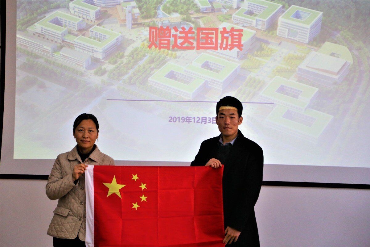 紧接着,出国学生代表刘少可同学进行发言,他表示出国学习要严格要求自己,养成良好的生活习惯;要明辨是非,学会取舍;最重要的一点是要坚守初心不忘本,心系祖国。发言结束后,直属党支部书记曲斌艳老师为学生们赠送国旗。