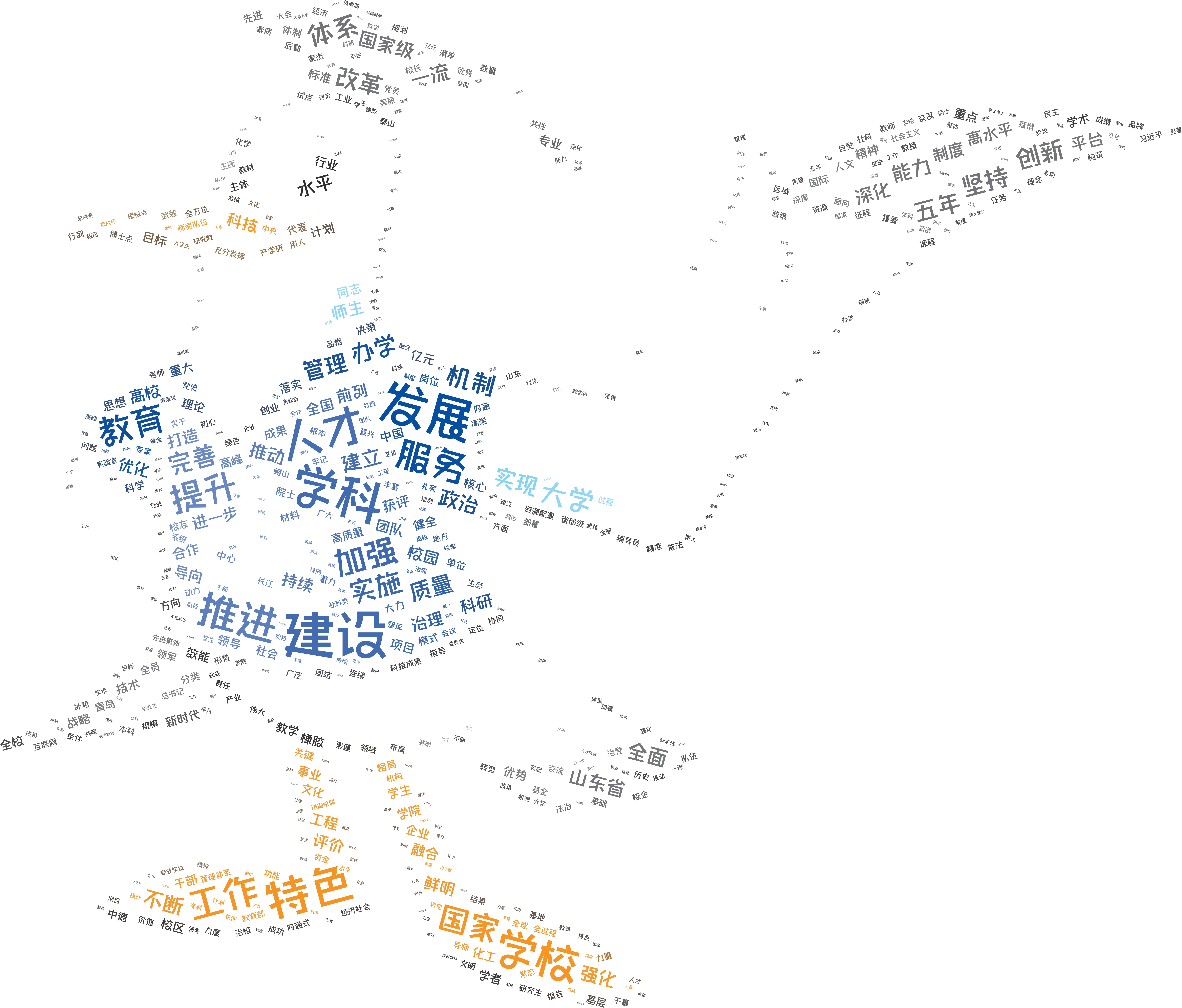 通过图1的词云图可以看出,建设、学科、发展、人才、特色、治理等词汇是大会报告中权重较大的,关键词词云图分析结果比较充分地展示了学校党代会报告的核心概念。