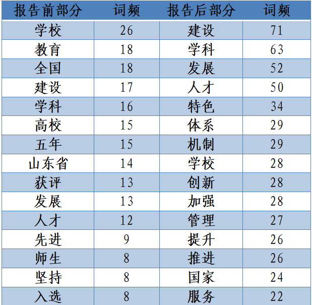 学校第十一次党代会报告意涵丰富,限于篇幅,本文于分析结果中择一二阐述。从核心理念、基础概念到报告新词,利用大数据思想,加深解读本次党代会的主题思想轮廓,充分表明学校已开启“深化人才强校、构筑学科高峰、提升治理能力,建设特色鲜明、走在前列的高水平大学”新征程。