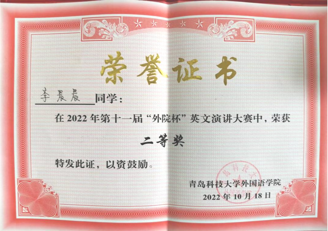 2022年“外研社·国才杯”英语演讲比赛于近日举行,青岛科技大学中德工程学院2021级6名同学在校区报名参赛,经过校区培训和选拔推荐,材料218班的李晨晨同学和化工212班的解晓蕾同学从校区选拔赛中中脱颖而出,并在学校决赛阶段发挥出色,均荣获大学英语组二等奖。