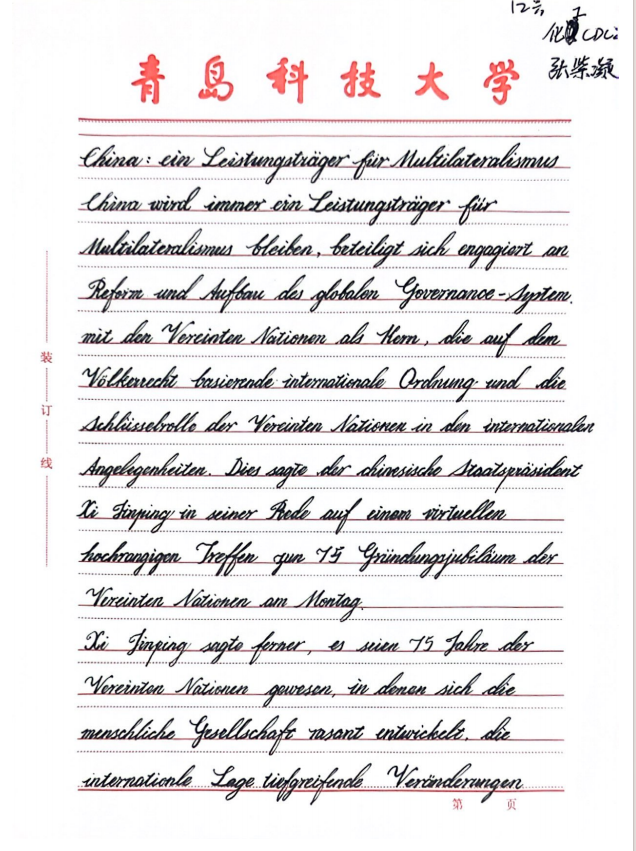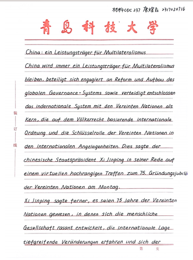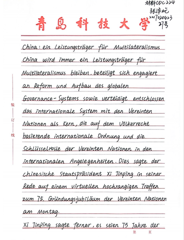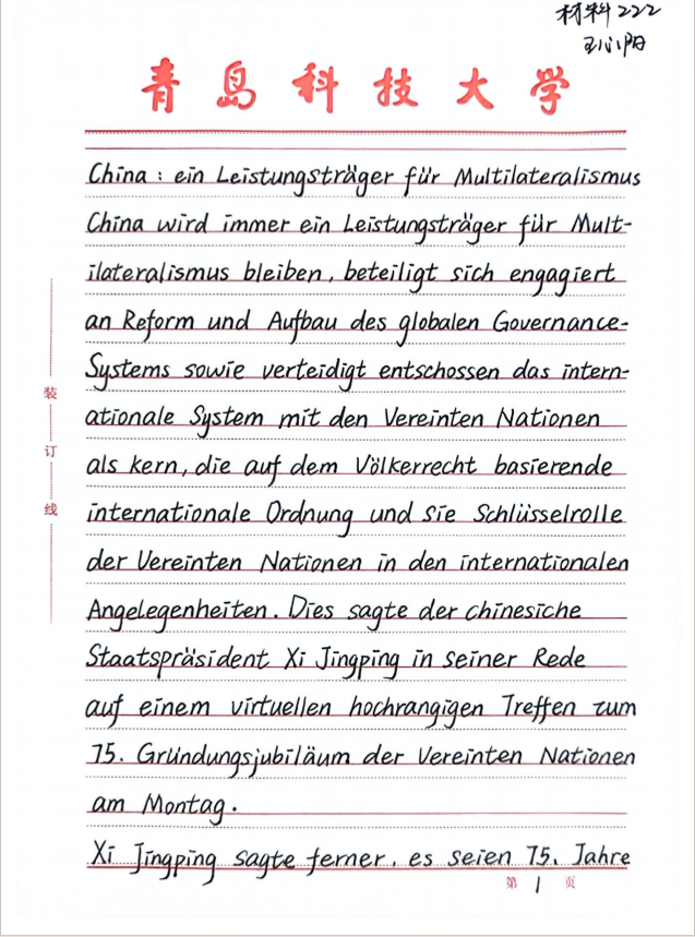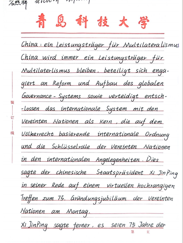 本次比赛作品内容节选自中国驻德国大使馆关于《国家主席习近平在第七十五届联合国大会一般性辩论上发表重要讲话》的德文原版报道。在比赛现场,指导教师就报道内容进行了讲解,借书写德语之力,加强学生们对国家发展的认识,提升民族自豪感,增强文化自信,引导学生讲好中国故事。