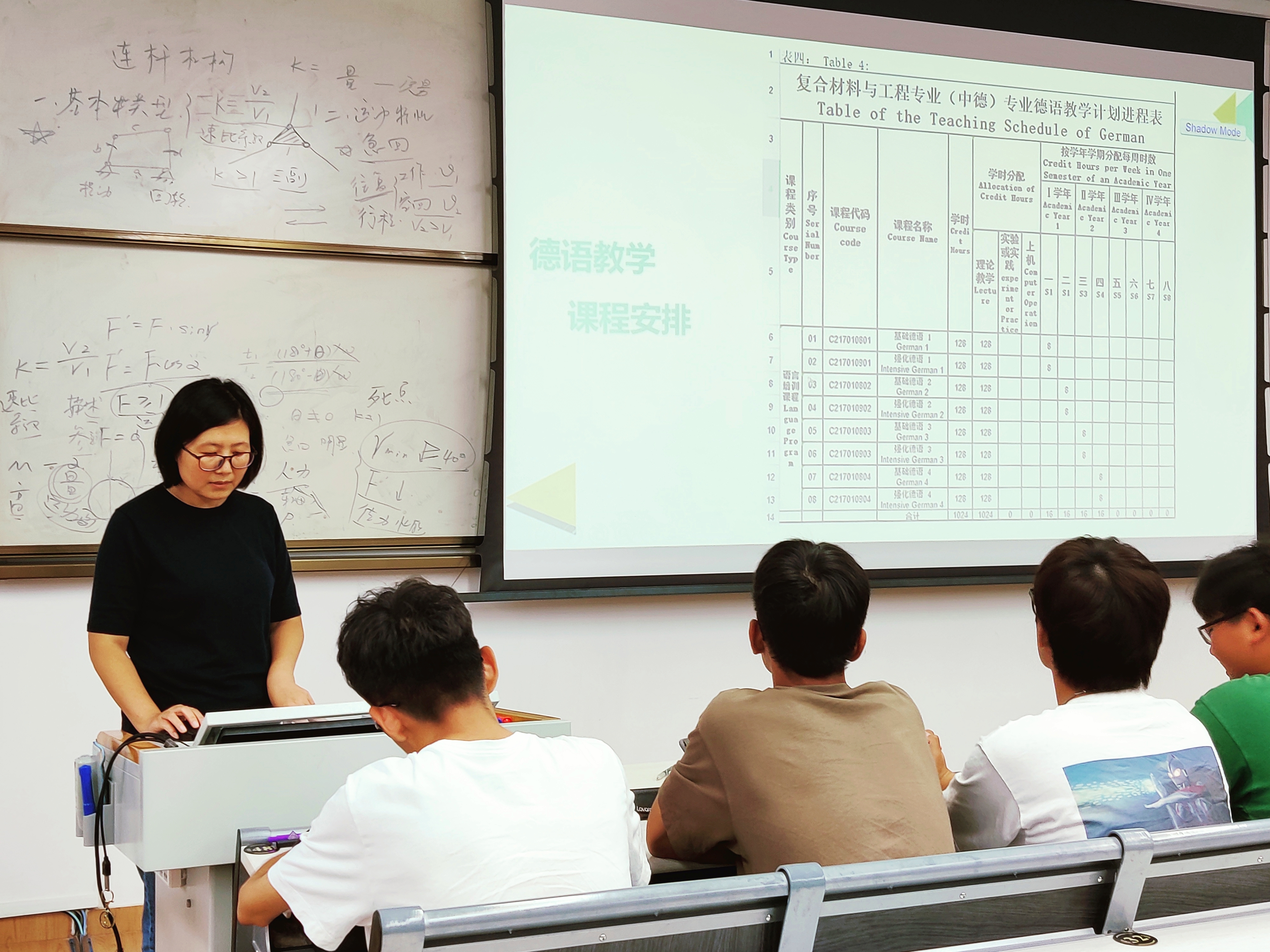 化学工程与工艺专业负责人李笋和复合材料与工程专业负责人杜娟老师结合学科专业特点,精心设计了专业启蒙教育,向新生介绍了专业背景、发展动态、特色优势和就业前景,帮助新生了解大学学习特点,掌握基本学习方法,开拓学科专业视野,激发专业兴趣和学习动力。各专业负责人还重点对人才培养方案进行了解读,帮助新生“读懂”专业内涵和价值,全面了解专业培养目标、课程体系、知识能力要求和教师团队等情况,帮助学生树立学习信心和专业志向;基于学院中德合作办学特色和学生实际需要,本次入学教育活动邀请德语教研室骨干教师孙静、刘倩倩向新生解读了德语学习的意义、特点和要求,介绍德语课程设置、德语师资团队、德语学习方法,帮助学生系统了解德语教学体系,帮助学生建立德语学习意识,明确德语学习目标,提升德语学习兴趣。