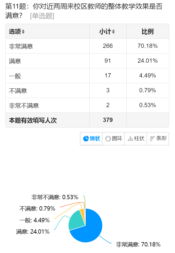 本次活动采取了线上问卷的形式,主要围绕线上教学授课方式、教师敬业程度、备课及课程设计情况、课堂互动及答疑等教学活动情况以及教师教学整体效果和学生学习整体效果的满意度等方面进行调查,同时,也征集了同学们对线上教学的意见和建议。