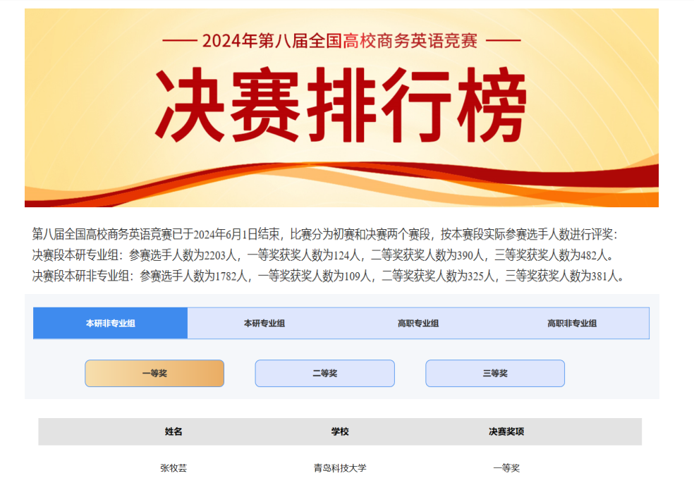 6月12日,第八届全国高校商务英语竞赛竞赛组委会公示了决赛结果。青岛科技大学中德工程学院学生张牧芸荣获全国一等奖,这也是中德工程学院学生首次在语言类学科竞赛中获得全国一等奖。