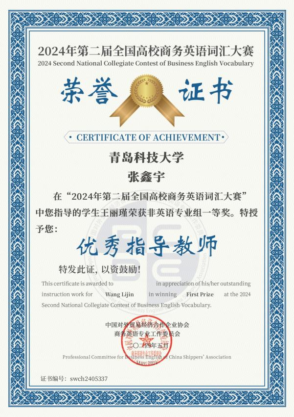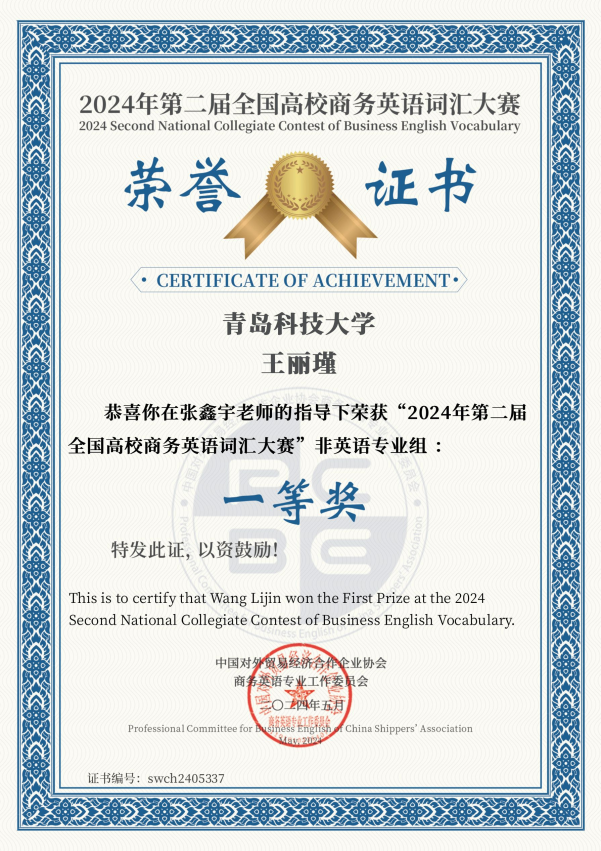 近日,由中国对外贸易经济合作企业协会商务英语专业工作委员会举办的第二届全国高校商务英语词汇大赛圆满结束。本次大赛吸引了全国众多高校的万余名学生参与,根据近日第二届全国高校商务英语词汇大赛组委会公示的竞赛结果,青岛科技大学中德工程学院5名学生分获一、二、三等奖,指导教师张鑫宇获得“优秀指导教师”称号,这是中德工程学院首次组织师生参加全国高校商务英语词汇大赛,初战告捷。