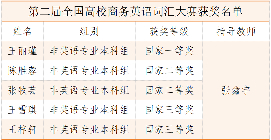 此次竞赛旨在实施《普通高等学校本科外国语言文学类教学质量国家标准》及《普通高等学校本科商务英语专业教学指南》,激发学生英语学习热情,扩展词汇量,深化词汇学习,并提供专业交流与学生展示自我的平台。赛前,学院积极组织学生报名,通过组织商务英语词汇专项模拟赛等形式开展了专项指导,充分的赛前准备夯实了参赛学生的商务英语知识和能力。经过激烈竞争,我院学生王丽瑾荣获一等奖;陈胜蓉、张牧芸荣获二等奖;王雪琪、王梓轩荣获三等奖。