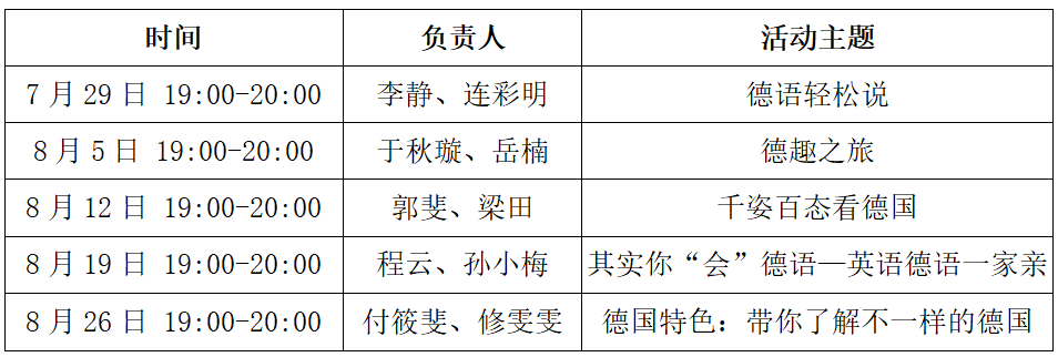 该活动从2024年7月29日至8月31日,共设置了5个主题周,开展了5期活动。每周活动分别由德语教学中心两位老师具体负责策划和主讲。主办教师根据活动主题及特点书写具体活动方案,静心制作ppt和设计教学环节,提前一周将活动内容、活动时间及参与链接发布到新生群里,组织新生认真、积极参加活动。全程利用腾讯会议开展线上教学和师生互动。