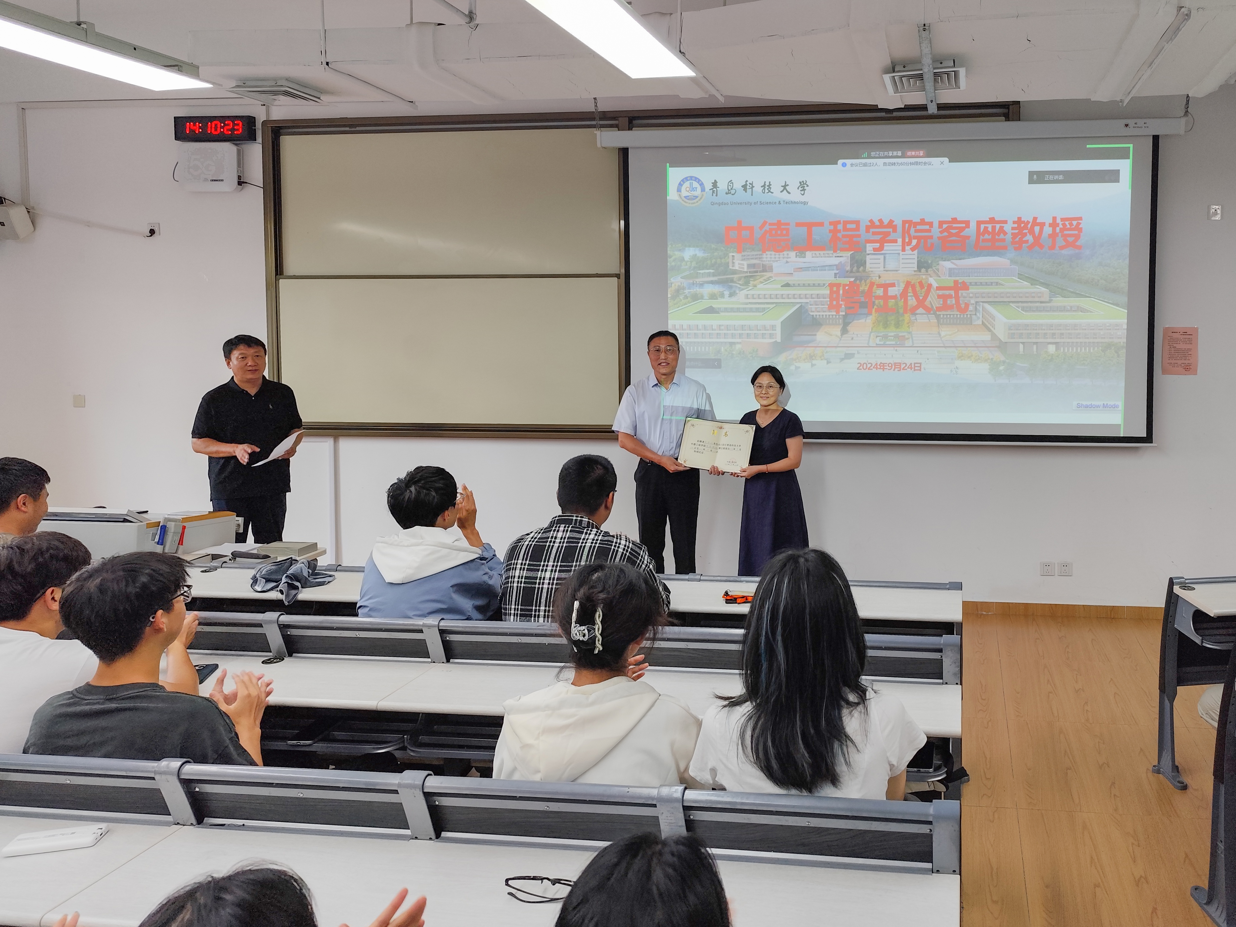9月24日,青岛市教育局二级调研员栾宏业(已退休)应邀担任我院客座教授,并在中德国际合作区(中德校区)教学楼J207教室举行了聘任仪式。学院院长王芳出席并颁发聘书,学院党委副书记兼副院长曲绍瑜主持聘任仪式。