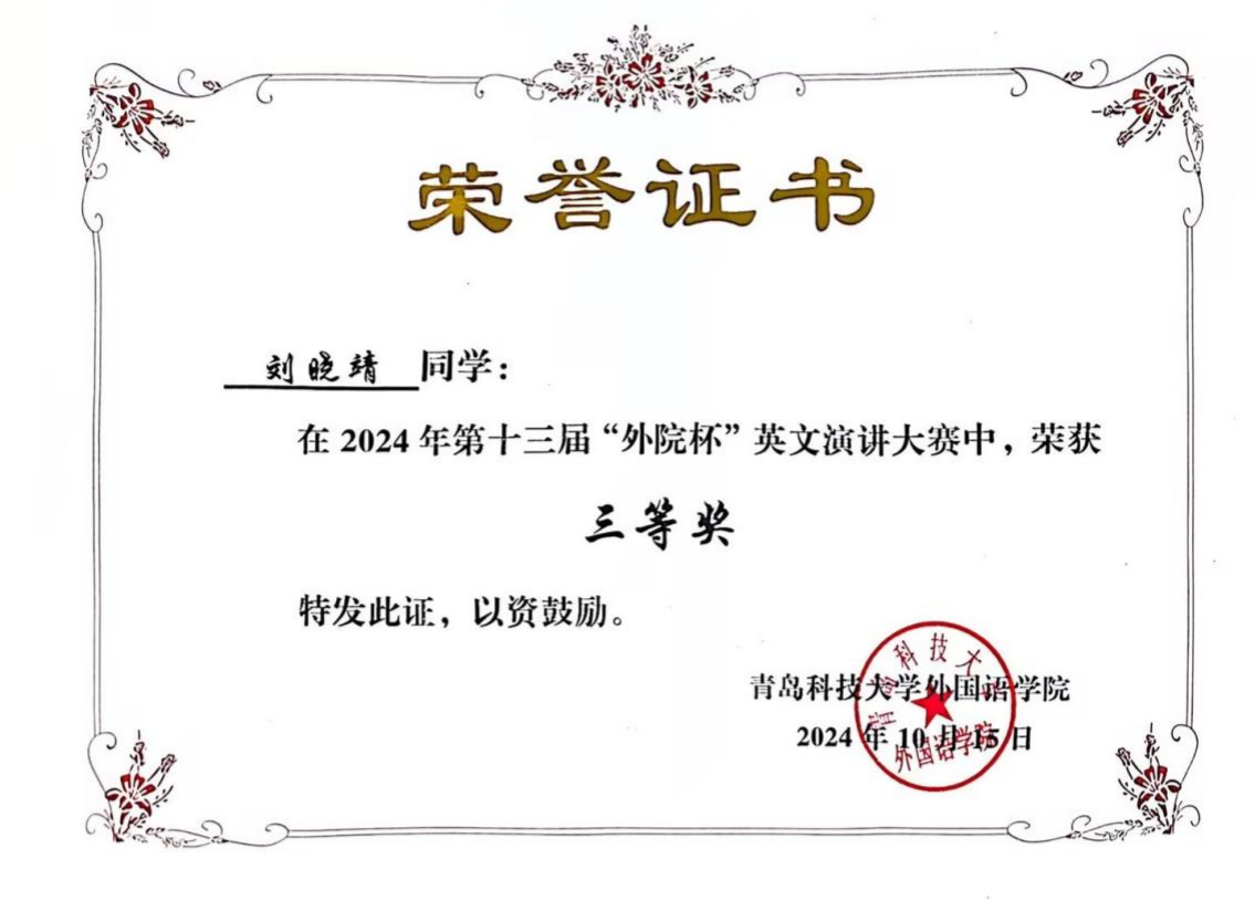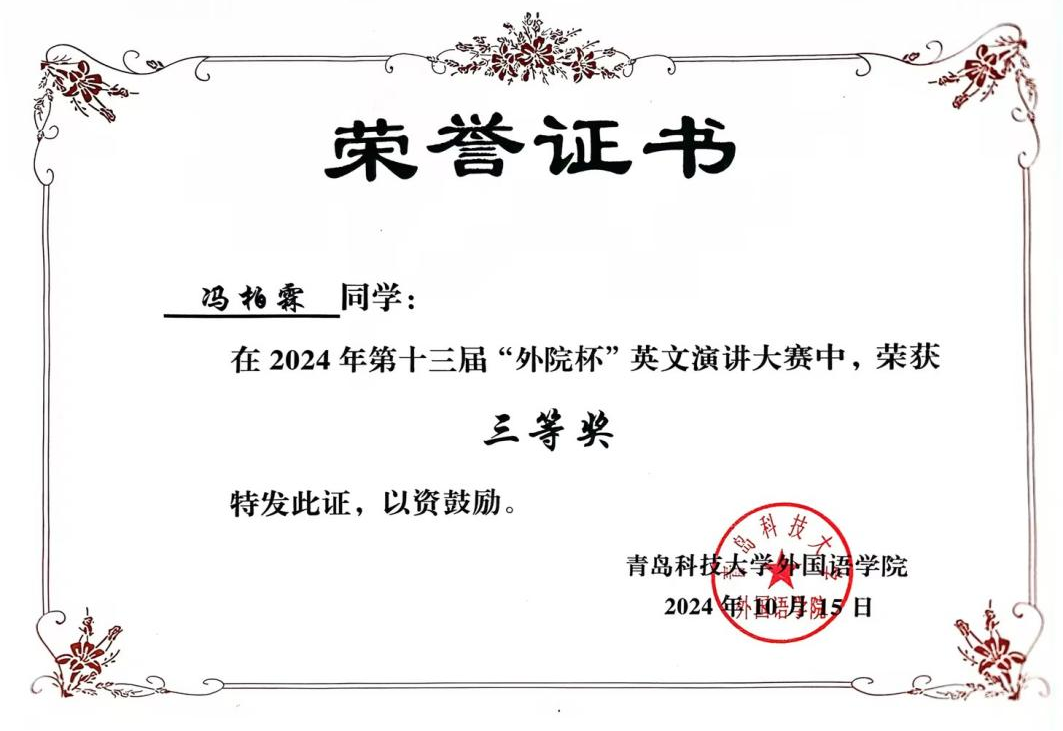 2024第十三届“外院杯”英文演讲大赛暨2024“外研社·国才杯”英语演讲大赛决赛于近日举行,中德工程学院选派的冯柏霖、刘晓靖2名同学在校级比赛中脱颖而出,荣获校赛三等奖。