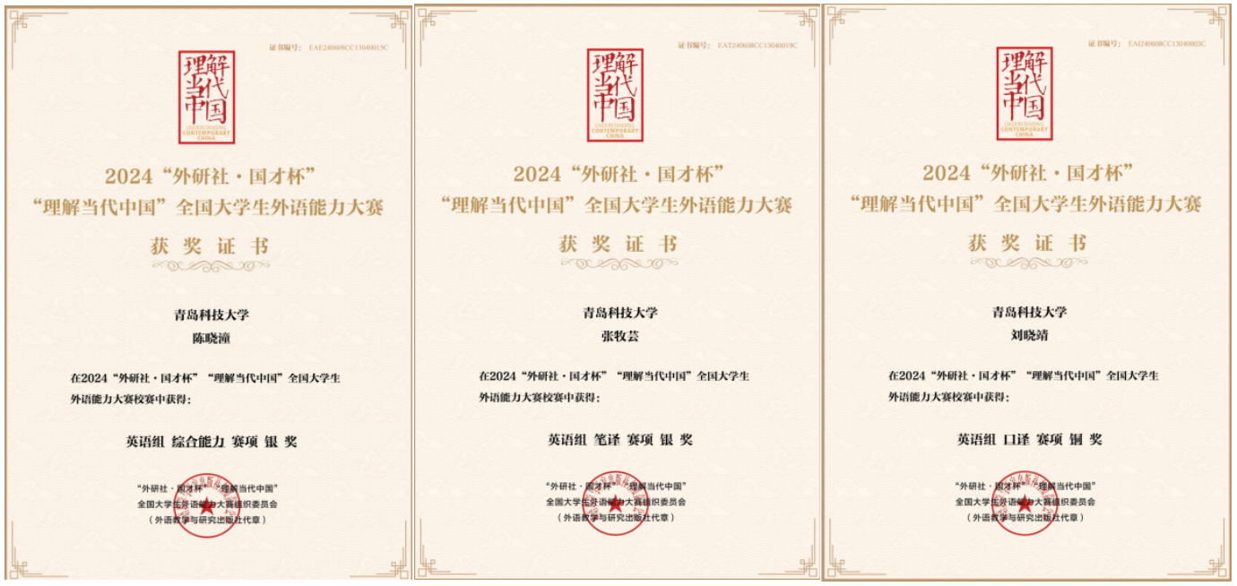 “外研社·国才杯”全国大学生外语能力大赛是外语类核心竞赛,连续多年入选《全国普通高校大学生竞赛分析报告》竞赛目录。大赛由北京外国语大学主办,外研社承办。以培养具有国际视野、家国情怀、创新意识、未来精神的高素质人才为目标,与新时代同向同行、共同前进,为广大学生培根铸魂、启智润心,是全国规模最大、最具权威性的英语演讲赛事,每年举办一届。英语赛道综合能力、笔译组、口译组是2024年“理解当代中国”全国大学生外语能力大赛系列赛项其中的三个组别,围绕“理解中国,沟通世界”的大赛主题,以考查学生综合能力为导向。经过预赛和决赛激烈角逐,在校级英语综合能力大赛中,中德工程学院张牧芸、陈晓潼同学荣获银奖,霍嘉毅同学获得铜奖;在校级英语笔译大赛中,中德工程学院张牧芸同学摘得银奖,李筱汶和蔡莹同学获得铜奖。在校级英语口译大赛中,刘晓靖同学获得铜奖。