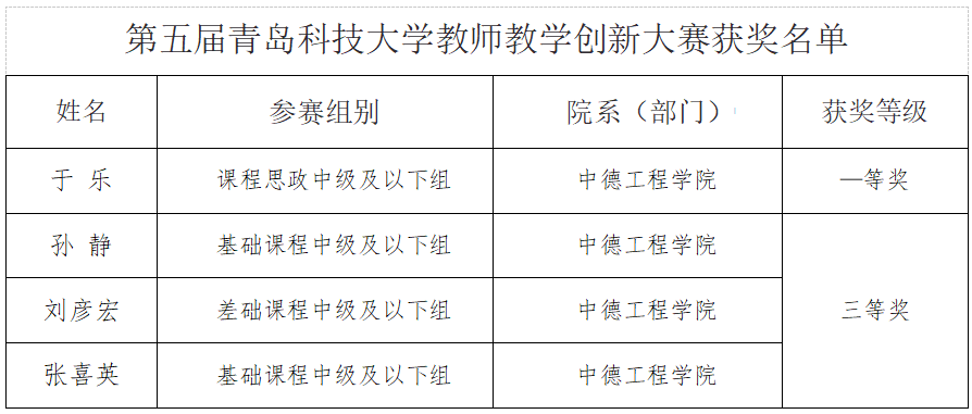 近日,学校公示了2024年度校级教师教学创新大赛结果,中德工程学院组织参评的4个课程团队均榜上有名,其中一等奖1人,三等奖3人,获奖率达100%,取得在该赛事上的历史性突破,充分展示了在教学改革与创新方面的显著成效。