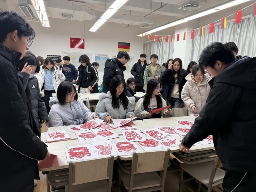 剪纸环节中,大家纷纷选择自己喜欢的花样,剪出充满新年气息的窗花和“福”字。一把剪刀,一张红纸,同学们通过自己的巧手剪出了精美的艺术作品。在动手实践的同时,老师以德语为媒介,生动地阐述了剪纸艺术背后所承载的深厚文化底蕴。学生们在享受创作乐趣的同时,不仅吸收了丰富的德语词汇,更深刻体会到了中华传统文化的独特魅力与深远影响。