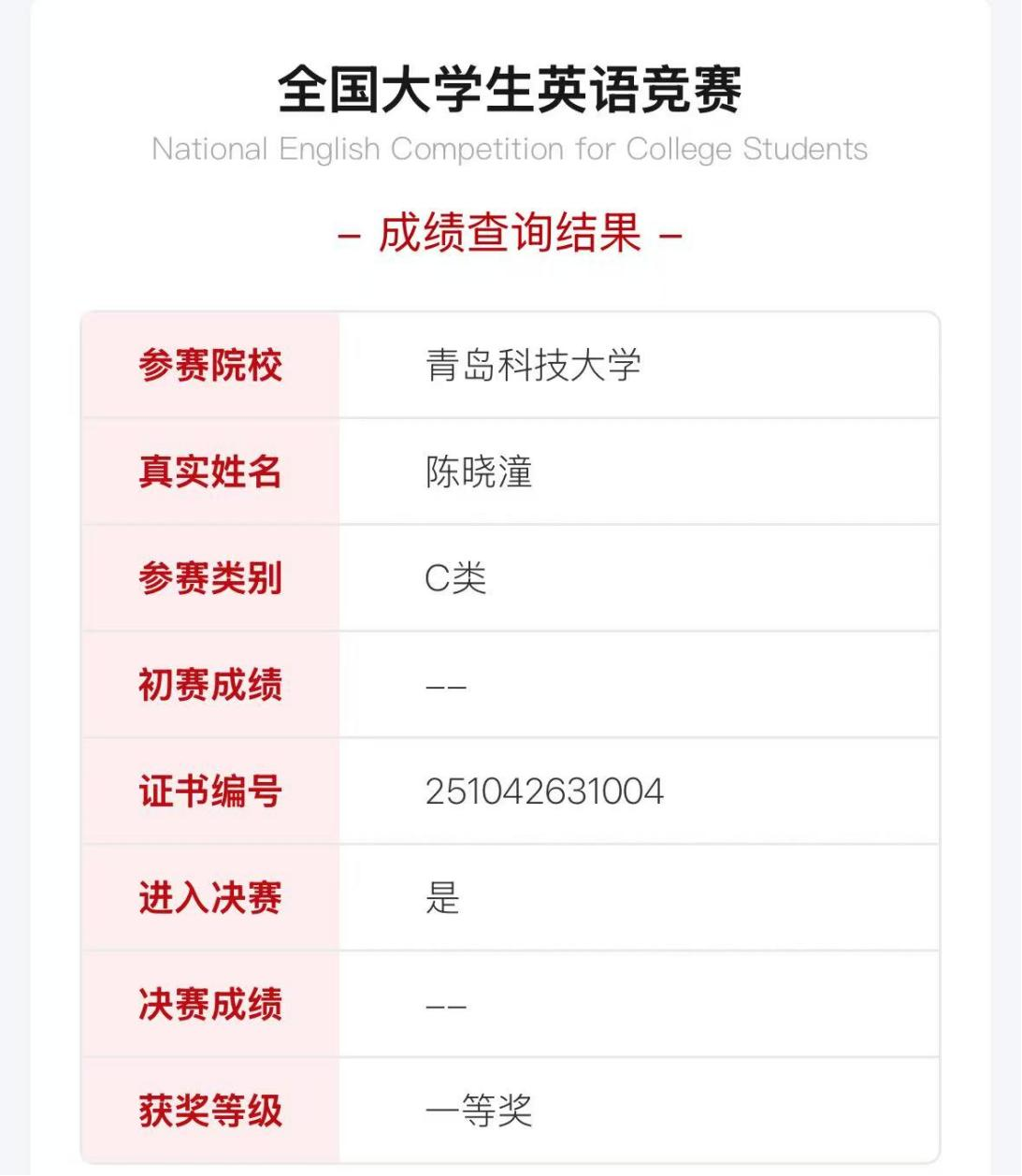 2025年5月11日,2025年全国大学生英语竞赛山东赛区决赛在山东师范大学举行。根据近日公布的竞赛成绩,中德工程学院材料227班学生陈晓潼喜获C类竞赛国家级一等奖,学院已连续三年在此竞赛中获国家级一等奖。