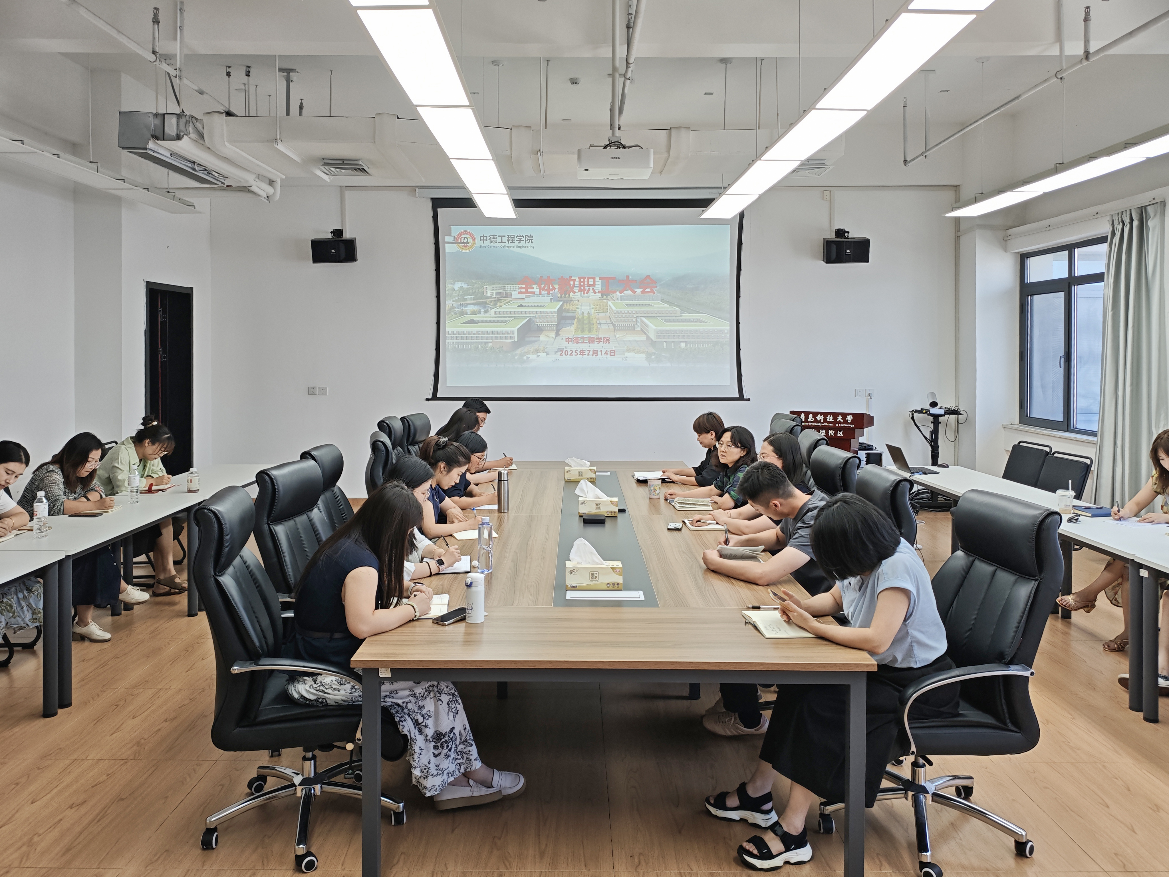 7月14日下午,中德工程学院在J402会议室召开全体教职工大会。会议由学院院长王芳主持,全体教职工参加会议。