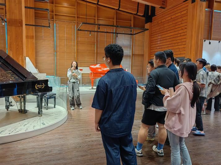 在教师引领下,学生们逐一欣赏馆藏的43架艺术钢琴,观看绘制过程的影像记录,聆听艺术家背后的创作故事,并沉浸于镇馆之宝——红色博兰斯勒钢琴借助5G技术奏响的经典旋律之中。音画交融,让同学们深刻感受到艺术所传递的情感与力量。期间,更有同学即兴弹奏,琴音与窗外的雨声相互映衬,为馆内平添一份灵动与温情。
