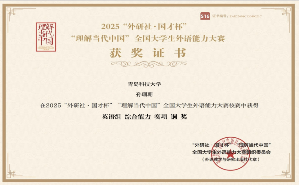 2025“外研社·国才杯”“理解当代中国”全国大学生外语能力大赛及2025“外教社杯”全国高校学生跨文化能力大赛于近日举行。中德工程学院选派的孙珊珊、刘晓靖、鲁金骐3名同学在校级比赛中脱颖而出,化工CDC231孙珊珊同学在“外研社·国才杯”“理解当代中国”全国大学生外语能力大赛综合能力赛项中获校级铜奖,材料CDC244刘晓靖和材料CDC241鲁金骐同学在“外研社·国才杯”“理解当代中国”全国大学生外语能力大赛演讲赛项中获校三等奖。材料CDC244刘晓靖团队在外教社杯”全国高校学生跨文化能力大赛中获校级铜奖。