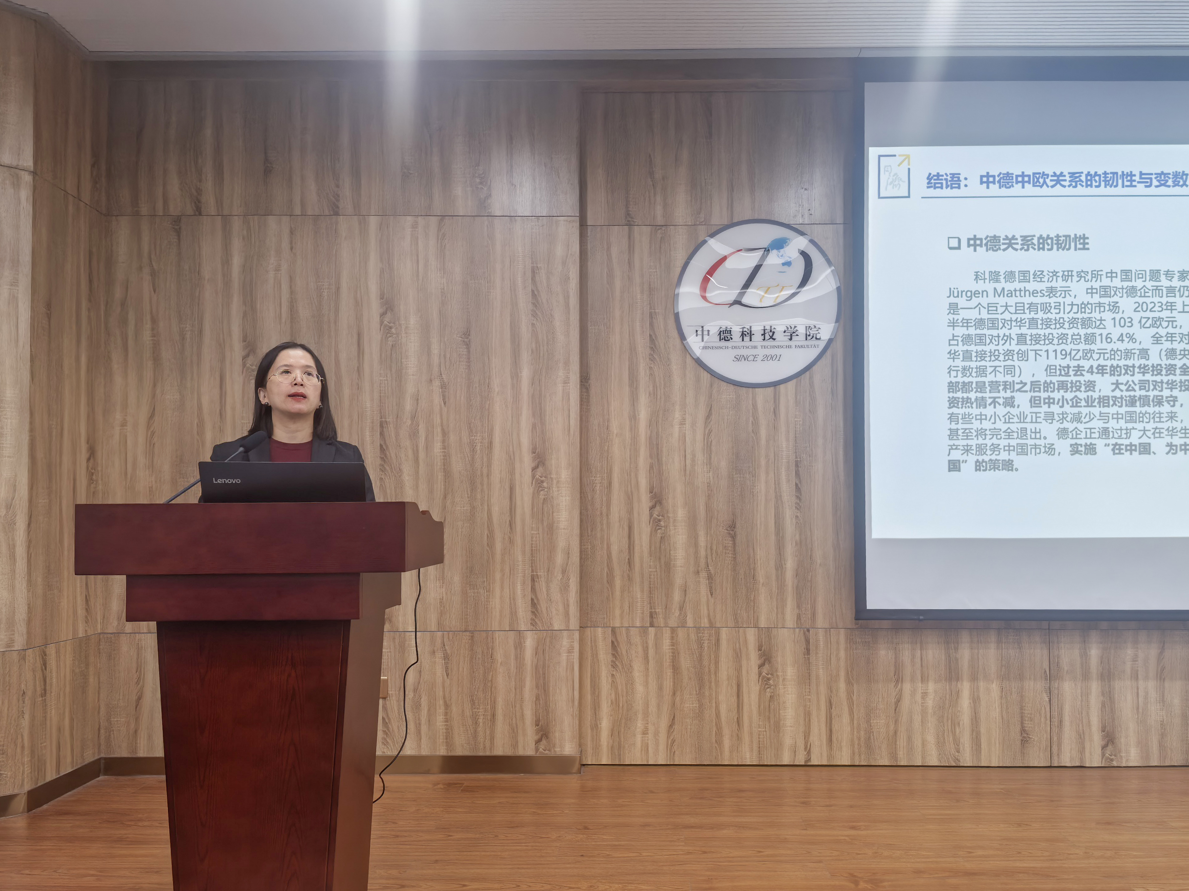12月5日下午,由国际交流合作处、人文社科处主办,中德工程学院、外国语学院、中德科技学院承办的“青科德语”学术论坛第五讲在中德科技学院C3103报告厅顺利举行。同济大学伍慧萍教授应邀作题为“时代变局下中德中欧关系的重塑”的学术报告。