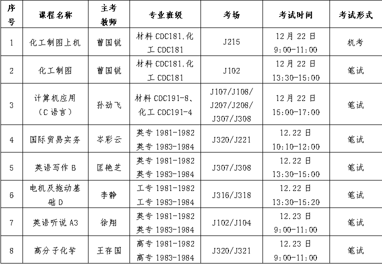 为督促学生更好的准备考试,共建优良考风考纪,现将本学期校区第十七周各门课程期末考试安排和要求通知如下: