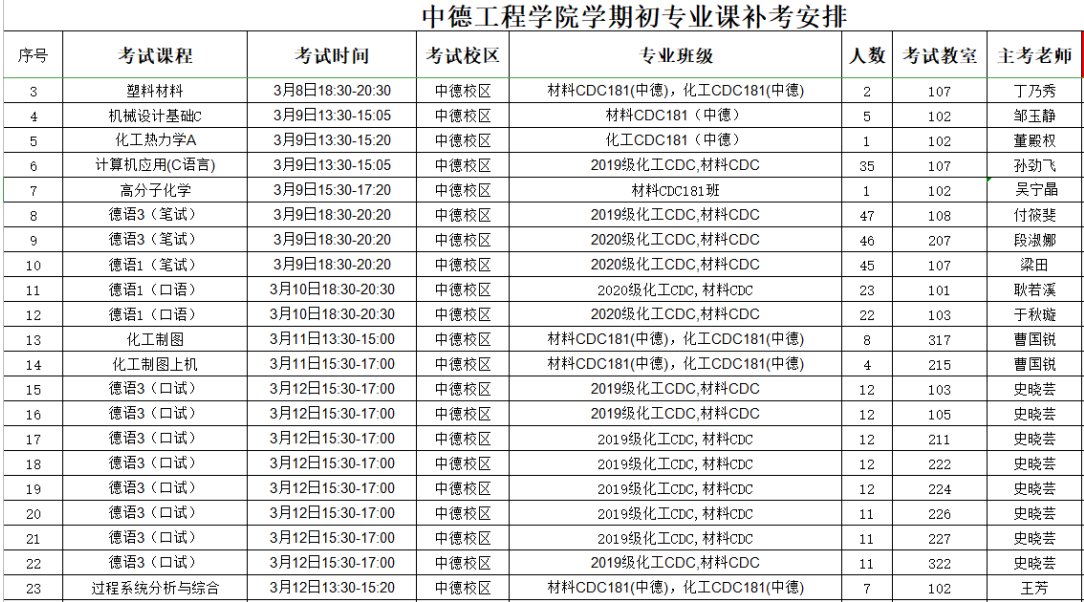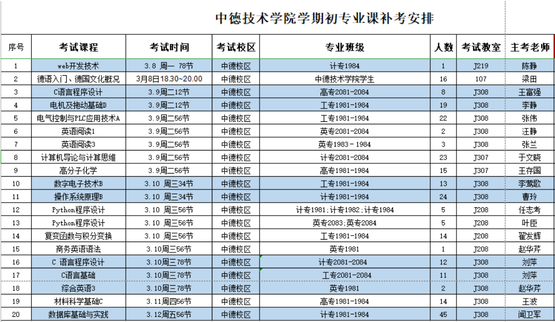 二、专业课补考时间为3月8-12日,具体安排见附表,考生务必按时参加考试,考前至少20分钟进入考场,并带好准考证、学生证和身份证,不带准考证不允许参加考试。