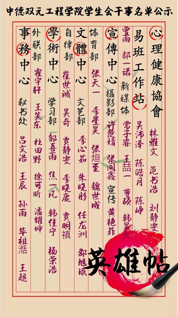 上一条:中德双元工程学院关于开展“最美班级”创建评比工作的通知 下一条:中德双元工程学院第一届学生会副部长以上成员名单公示