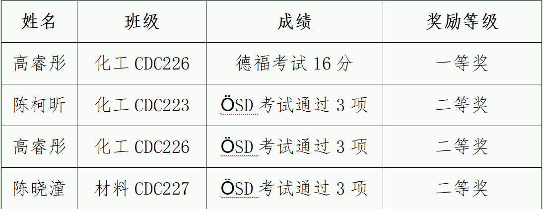 根据《中德工程学院德语教学质量提升专项奖励办法》,为激发全体学生提高德语学习兴趣、学习能力和学习效果,进一步落实中德合作办学人才培养目标,根据本学期德福考试和ÖSD考试(B1级别)成绩,中德工程学院评选出了首届“德语学习之星”,现将获奖名单公布如下: