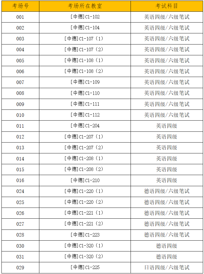 中德校区2025年上半年大学外语四六级考试考场信息表