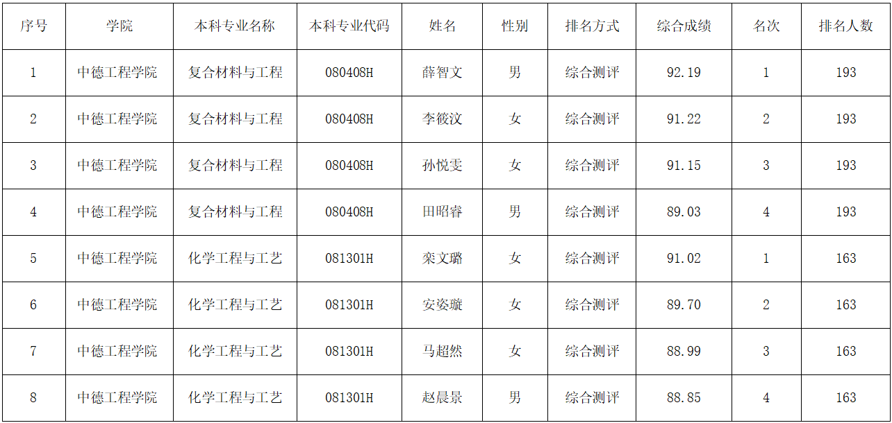 根据《青岛科技大学2025年推荐优秀应届本科毕业生免试攻读硕士学位研究生工作方案》和《青岛科技大学中德工程学院推荐2026届优秀应届本科毕业生免试攻读硕士学位研究生工作实施细则》,经个人申请、资格审核、学院评审,以下8名同学获得免试攻读硕士学位研究生推荐资格,现予以公示。公示期为2025年9月9-11日。