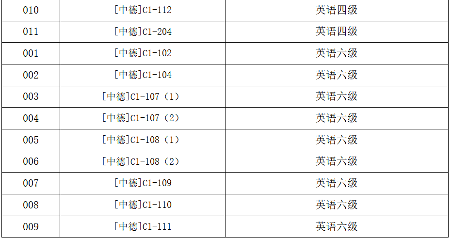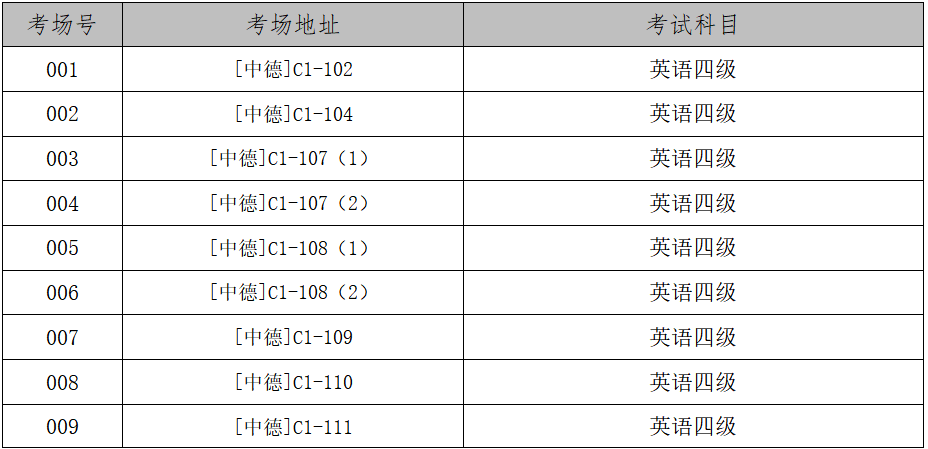 中德工程学院2025年下半年大学英语四六级考试考场信息表