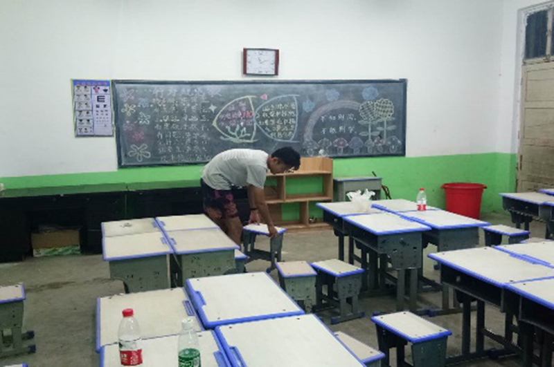 花费近十小时,团队终于赶在天黑前到达了目的地。尽管提前做好了吃苦的准备,但37度的酷暑还是使大家有些猝不及防。采取相应的避暑措施后,全体成员参观起了小学内的环境。小学的硬件设施比预计的好的多,教室内多媒体、图书角和空调等都具备。为了有一个更好的教学和工作环境,组员们一来便打扫起卫生,让陈旧的教室焕然一新。