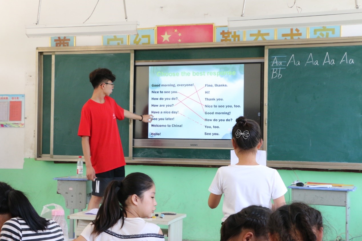 通过对学校教学水平和学生对在校所学知识掌握程度的了解,学校对英语的重视程度远远不足,另外随着年级的升高,知识水平与年龄不相匹配,对此,我们开展了英语课程。通过课前准备,课上精讲、互动,课下反馈等多种方式进行英语的提高和学习。7月22日,我们开始了英语试讲并进行了第一堂英语课的学习。