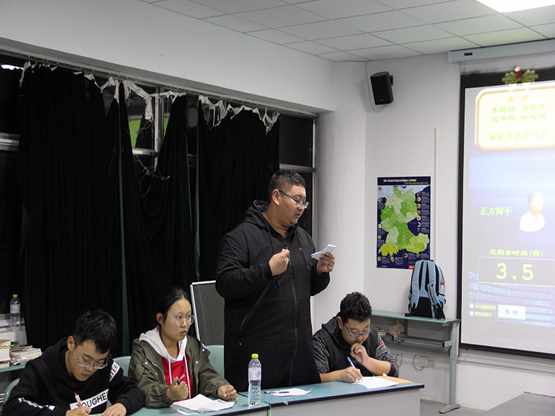 为了提高学生的语言表达能力,为校“育新杯”辩论赛做好准备。中德双元工程学院于10月29日晚上八点在弘毅楼C405教室举行辩论赛热身赛。辅导员付继航老师、学生会常务副主席刘少可、副秘书长岳小垒、副主席王亚锋、学术中心部长刘春霖、副部长薛蕾蕾以及其他学生会成员共同参加。本次活动由学术中心举办,戴乾文担任辩论赛的主席。
