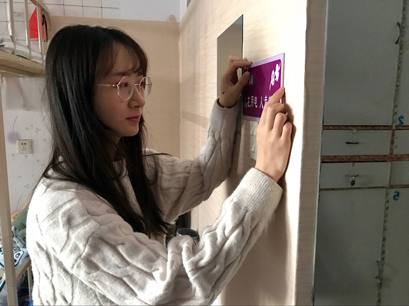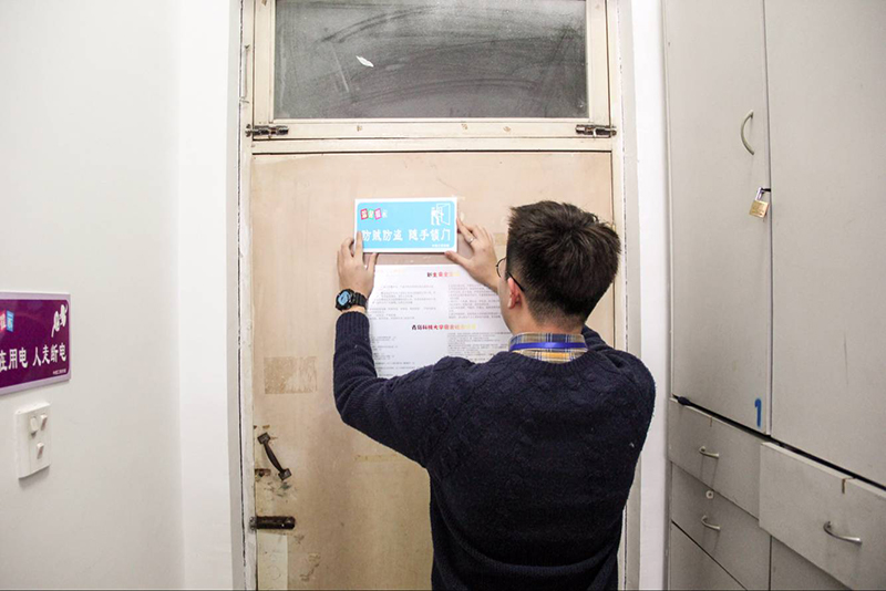 随后,检查人员指导学生在寝室张贴安全标语。醒目的“人在用电,人走断电”、“防贼防盗,随手关门”标语时刻提醒着同学们将“安全”二字牢记心间。