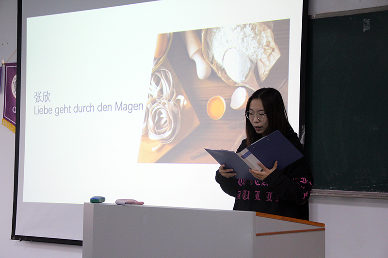 德语演讲比赛中,何一诺同学用德语讲述了与父亲之间的点点滴滴,将父爱的平凡而伟大表现得淋漓尽致。李思凡同学带大家了解了德国的特色小吃。韩佳楠同学认为,生活好坏在于自己的态度,只要自己觉得幸运,生活总是美好乐观的。张善彦同学认为坚守自己、坚守原则,生活才是完整的。韩佳楠同学和张善彦同学都以生活为主题,却体现也自己不同的见解,使观众们领略了演讲的魅力。