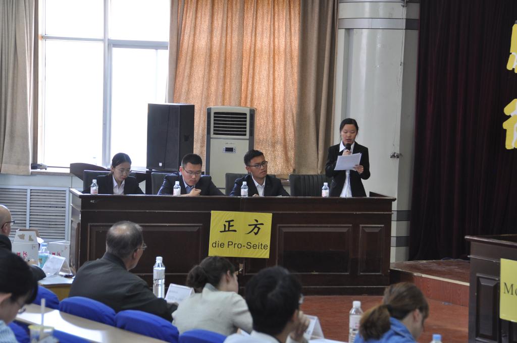 第一场比赛为外国语学院对战中德工程学院,在双方进行了简洁的自我介绍后,比赛正式开始。双方就“Sollen unheilbar Kranke einen Anspruch auf lebensbeendende Maßnahmen haben?(无法治愈的患者是否有权享受终身措施直到生命结束?)”展开论述,正方外国语学院认为: Ja, Ärzte sollen Leid ersparen und auf Verlangen eine Selbsttötung unterstützen.(医生应避免增加患者多余的痛苦和提供自杀援助)而反方中德工程学院认为:Nein, Ärzte sollen das Leben schützen und eine Selbsttötung nicht unterstützen.(不,医生应该保护生命而不是自杀支持)辩论开始后,双方选手在立论,驳立论等环节中思路清晰,使现场气氛迅速升温。在随后进行的自由辩论环节中,双方选手就辩题展开更深层次的辩论,将比赛推向高潮,比赛最后还有现场观众提问环节。赛后,评委任铮铮老师对本次比赛做了总结,她充分肯定双方在辩论时的活跃表现,同时也提出了希望改进的不足之处。最终,外国语学院获得胜利。