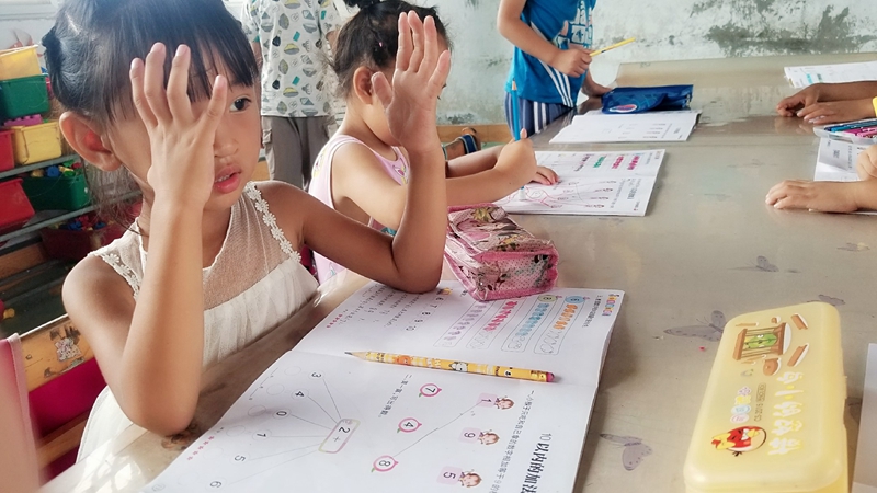在进行短暂的工作会议后,队伍开始了一整天的课程。课堂里,孩子们积极的配合我们布置的课堂互动,主动和我们分享前几天学习的笔画,加减法以及刚学会的简笔画。其中一个特别可爱的孩子算数时认真的模样被我们用照片永远的记录了下来。
