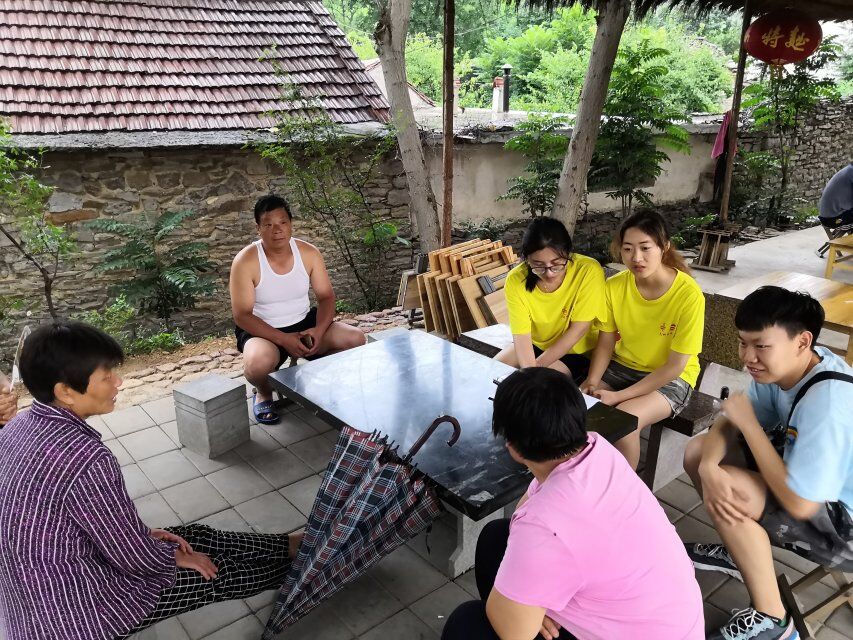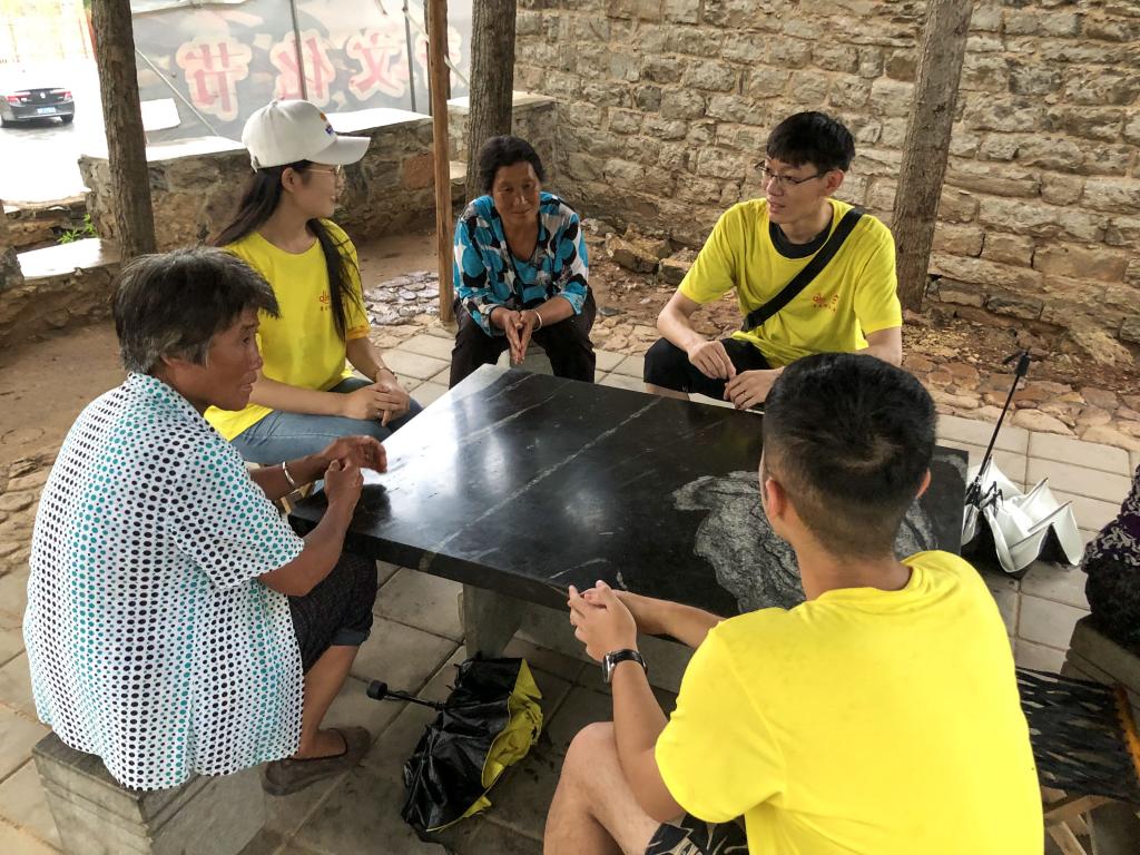 达村口,首先映入眼帘的是一条被雨水冲刷干净的柏油马路,随处看见的是扶贫的标语口号。村内有一长廊,许多老人带着孩子在长廊里乘凉。见到村民们,队员们立刻拿出提前准备好的调查问卷和记录本,采访村民关于教育观念的问题。根据孩子年龄阶段的不同,队员设置了三份调查问卷,分别为学前教育组、小学组以及中学组,并在三份问卷中设置了相同问题,以便做比较分析。