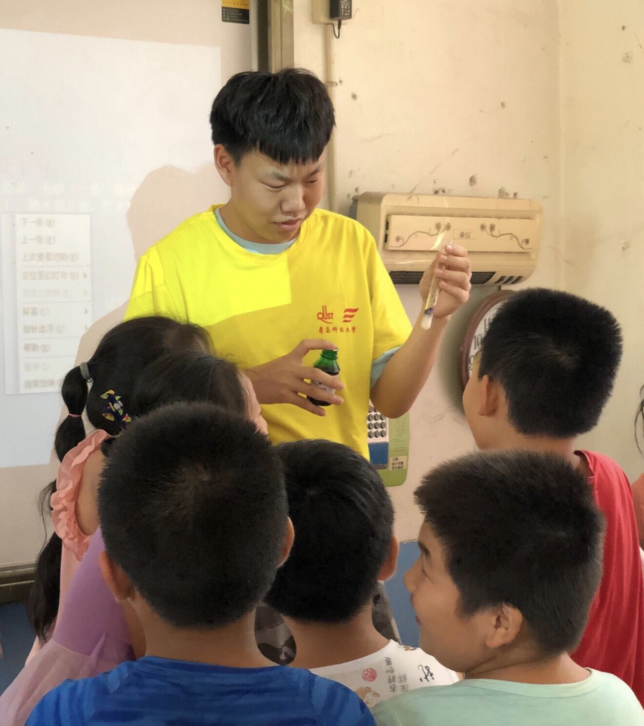 乡村条件有限,学校里虽然开设了科学课但其授课方式仅限于背诵而已,针对这种情况成员们今天开设了化学实验课。课上给孩子们讲述了如何闻化学试剂以及如何清洗实验器材,在酒精的燃烧实验中当他们看到酒精燃烧的那一刻时都瞪大了双眼喊着“着了”,“着了”。 成员们希望孩子们以后也能在条件有限的情况下,能主动利用日常生活中可见的东西自己动手做实验,希望他们能主动去探索科学的奥秘。
