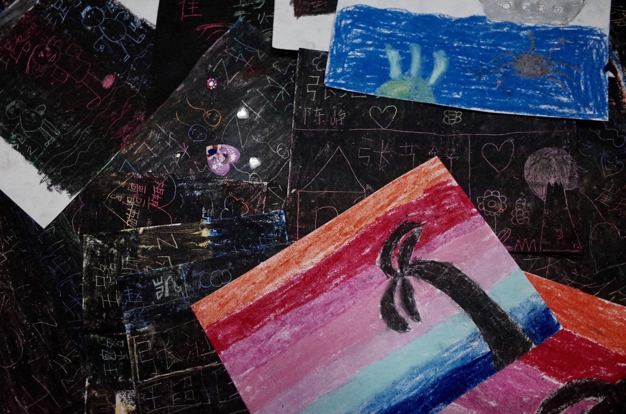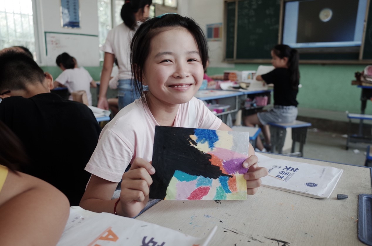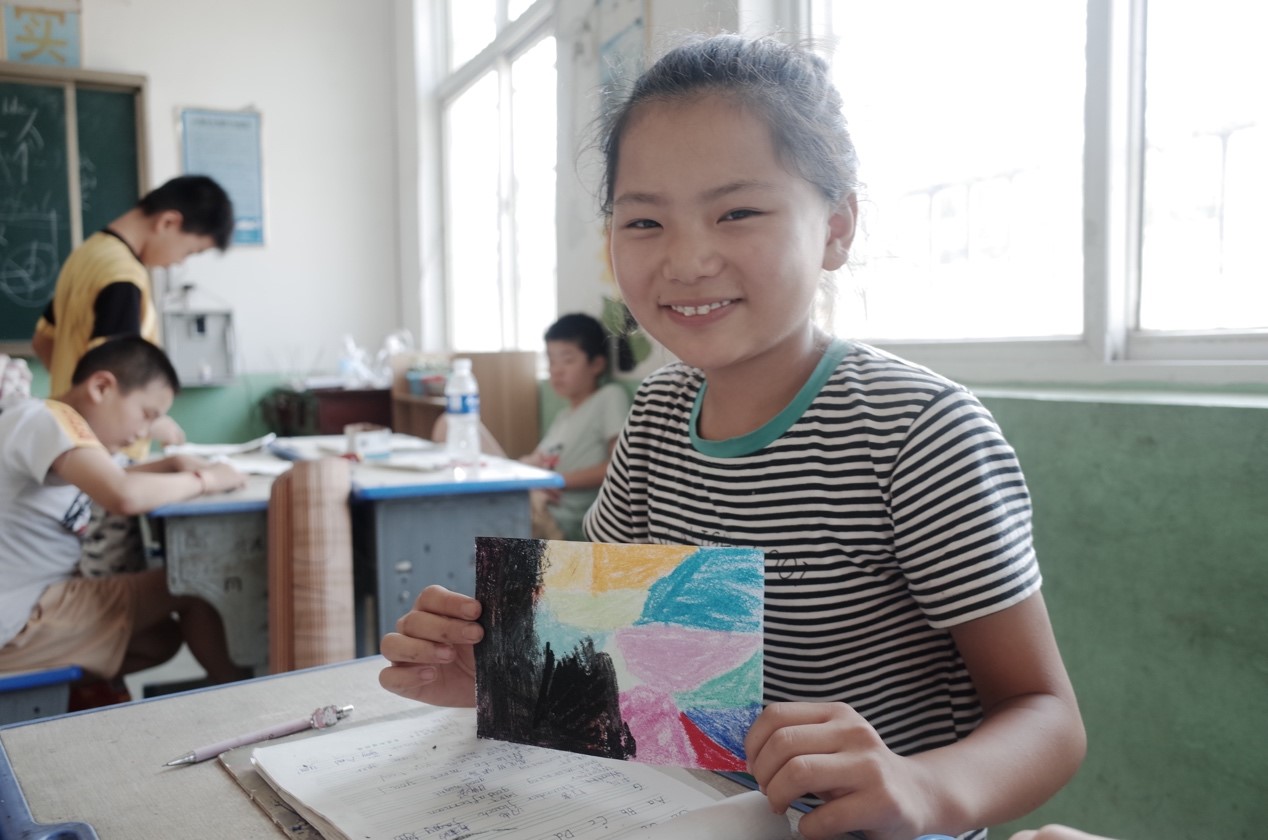图为孩子们在绘画过程中的喜悦