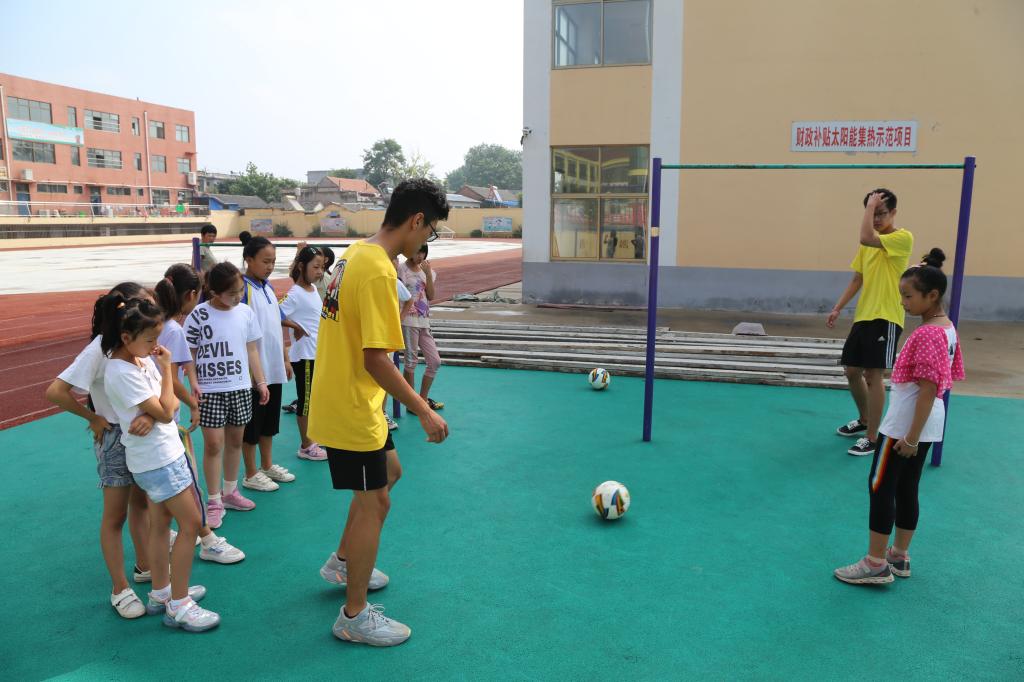 成员们了解到,孩子们平时很少有音乐课和体育课,而且上课时接触乐器、体育器材的机会也很少。为了促进孩子全方面发展,成员们准备了音乐课和足球课。在音乐课上,成员向大家讲解了钢琴的发声原理,并教给大家认识五线谱。孩子们对钢琴产生了强烈的兴趣,踊跃地尝试着对照乐谱弹琴。还有孩子勇敢地走上讲台与成员们一起为大家唱歌。还记得与孩子们接触的第一天,孩子们连自我介绍都是十分羞涩,现在却能够大胆地表现自己。孩子们收获的不仅仅是知识,更是一种敢于证明自己的勇气,这种勇气会给孩子们创造更多表现自己的机会,也会为孩子们的成长增添更多色彩。