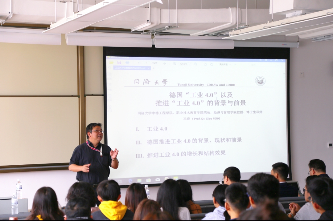 在主持人的介绍后报告正式开始,冯院长所做的报告主题为“德国‘工业4.0’以及推进‘工业4.0’的背景与前景”,冯院长首先向同学们详细介绍了“工业4.0”的背景,以历史为切入点将同学们引进主题;另外讲解了推进德国“工业4.0”的现状和前景;最后通过讲解推进“工业4.0”的增长和结构效果,同学们有了更深入的了解。讲解报告过程中,冯院长渊博的知识、严谨的论证、风趣的语言给中德工程学院的师生们留下了深刻的印象。
